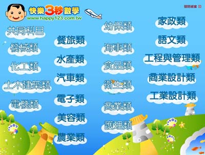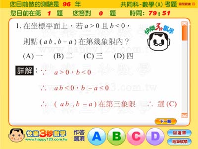 本題庫光碟內容除共同科目(國文、英文、數學)外,還備有多類科的考題。數學科更有詳細解答,畫面時間呈現倒數計時,猶如現場考試,答對或答錯電腦會馬上答覆讓您更快速掌握自己的學習狀況哦!